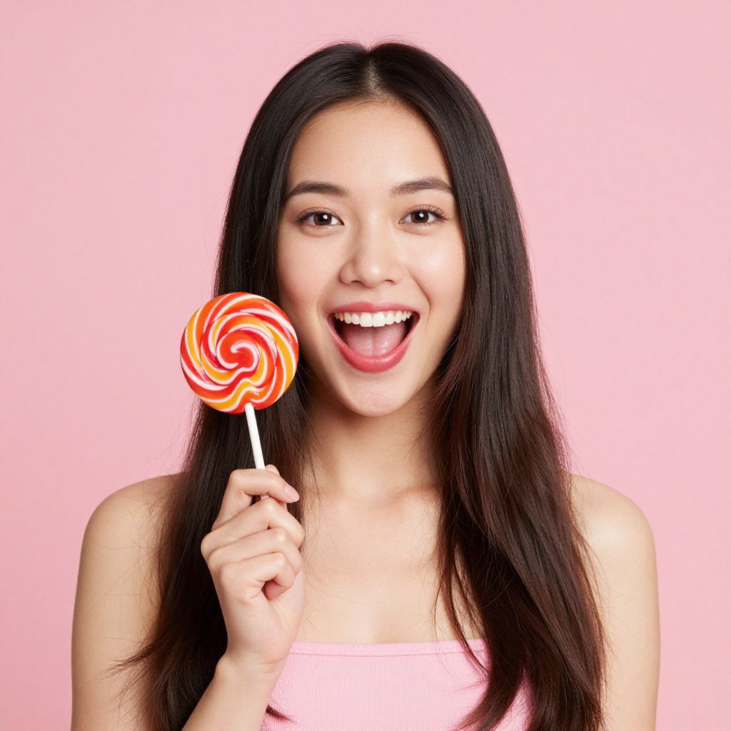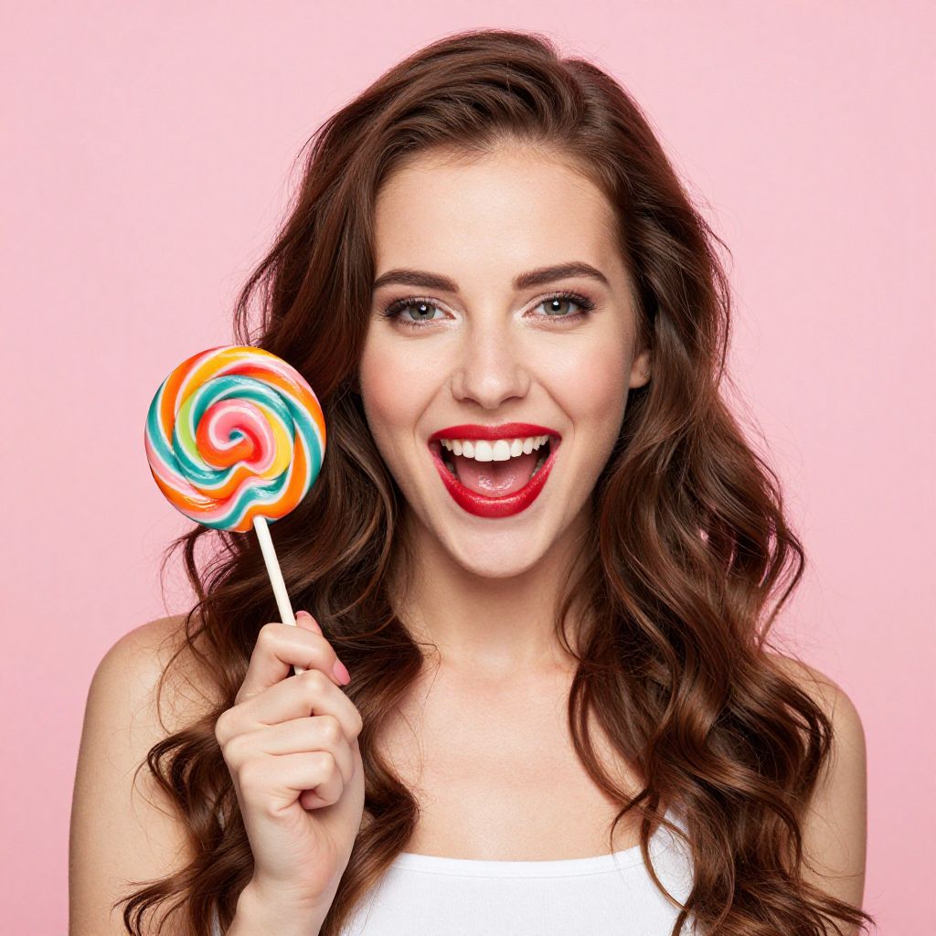 Photograph of a smiling woman with long, wavy brown hair, holding a colorful swirl lollipop against a pink background. She wears red lipstick and