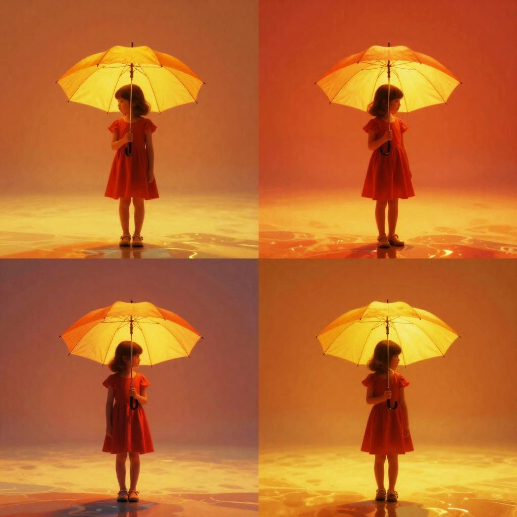 Photograph of a young girl in four quadrants, each with a distinct warm orange and yellow gradient background. She stands centered, holding a glowing orange umbrella that casts a soft light on her. She wears a red dress with short sleeves and red shoes, her blonde hair loose. The umbrella's light creates a reflective pool on the floor beneath her. Each quadrant shows a slightly different angle, emphasizing the umbrella's glow and the girl's silhouette. The overall mood is warm and ethereal.