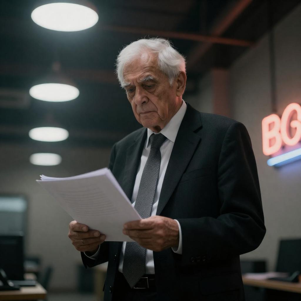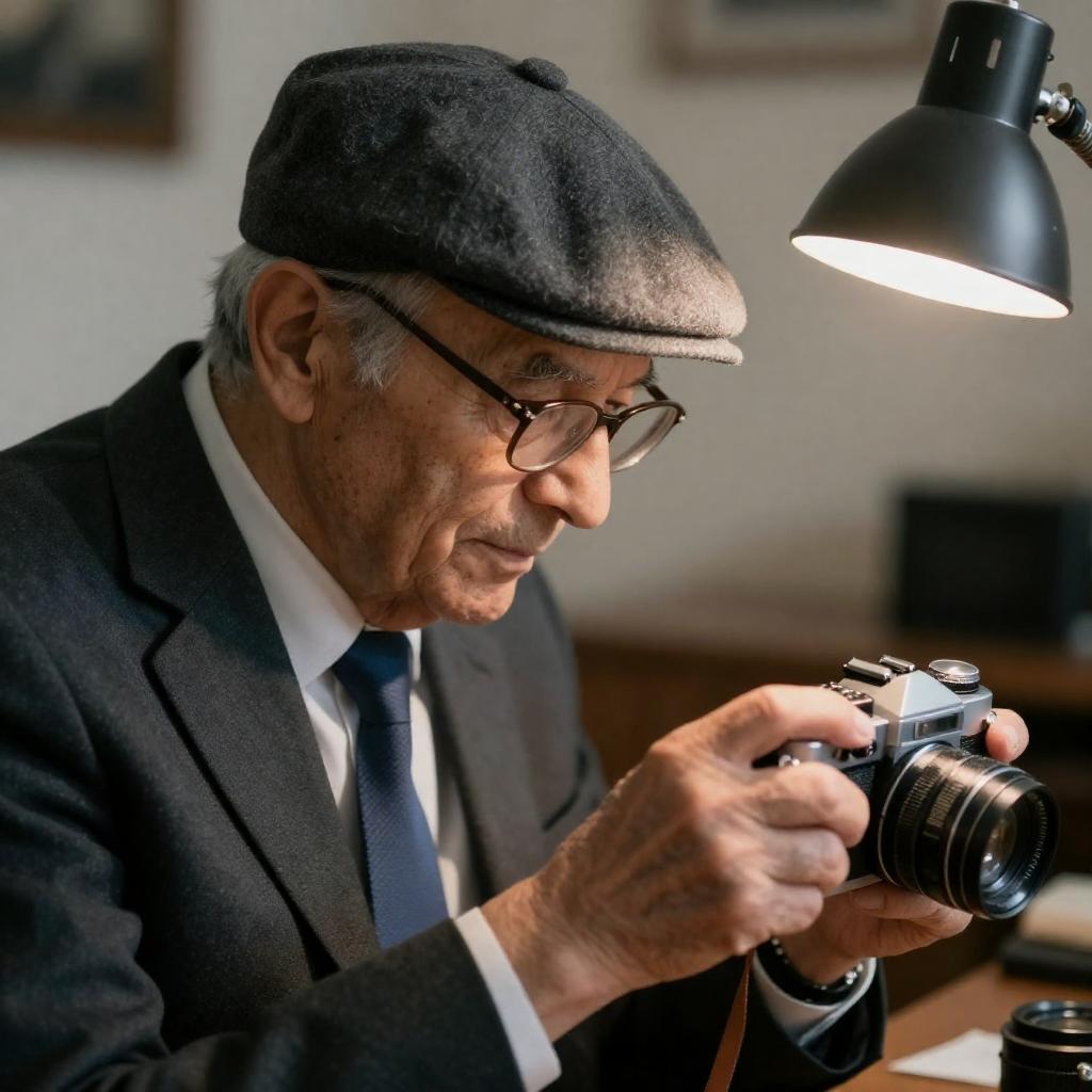 Old man with gray flat cap, glasses, dark suit, white shirt, blue tie, focused expression, leaning forward, examining vintage camera. Camera on right, black lamp above, blurred background. Indoor setting, close-up.