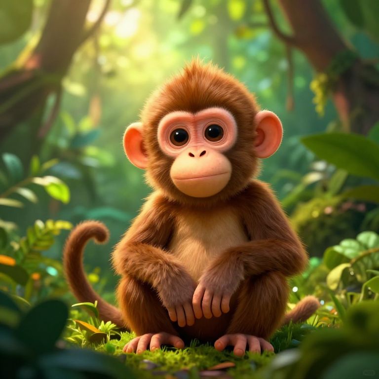 A vibrant, digital CGI illustration of a cute, young monkey with large, expressive brown eyes, and a small, pinkish nose. The monkey has soft, brown fur with a lighter beige face, chest, and hands. It sits on lush, green forest floor, surrounded by bright green foliage and sunlight filtering through the dense trees in the background. The monkey's small, pink ears are prominent, and its tail curls slightly upward. The overall style is whimsical and colorful, emphasizing a sense of innocence and curiosity in the jungle setting.