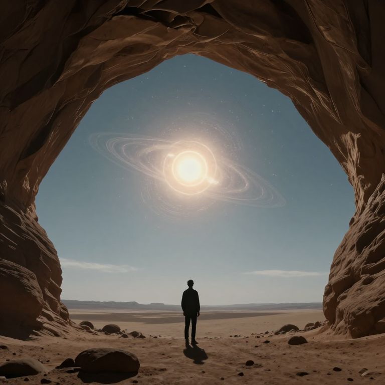 A lone figure stands in a vast, otherworldly landscape, gazing at a glowing, celestial body through a natural archway.