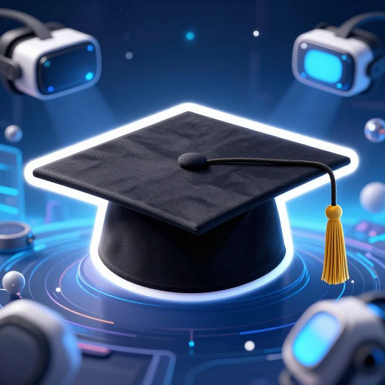 Peel And Stick A logo based on a graduation hat surrounded by digital world with different virtual reality gadgets, highly detailed,