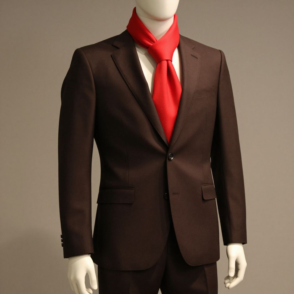 A mannequin wearing a brown suit with a red scarf around his neck, standing in a neutral, minimalist setting, with a focus on the contrast between the dark suit and the vibrant red scarf. The mannequin is posed in a confident, slightly forward-leaning posture, emphasizing the style and elegance of the outfit. The background is simple, with soft lighting to highlight the details of the clothing and the mannequin's form. The overall atmosphere is sophisticated and slightly mysterious, blending professionalism with a touch of intrigue.