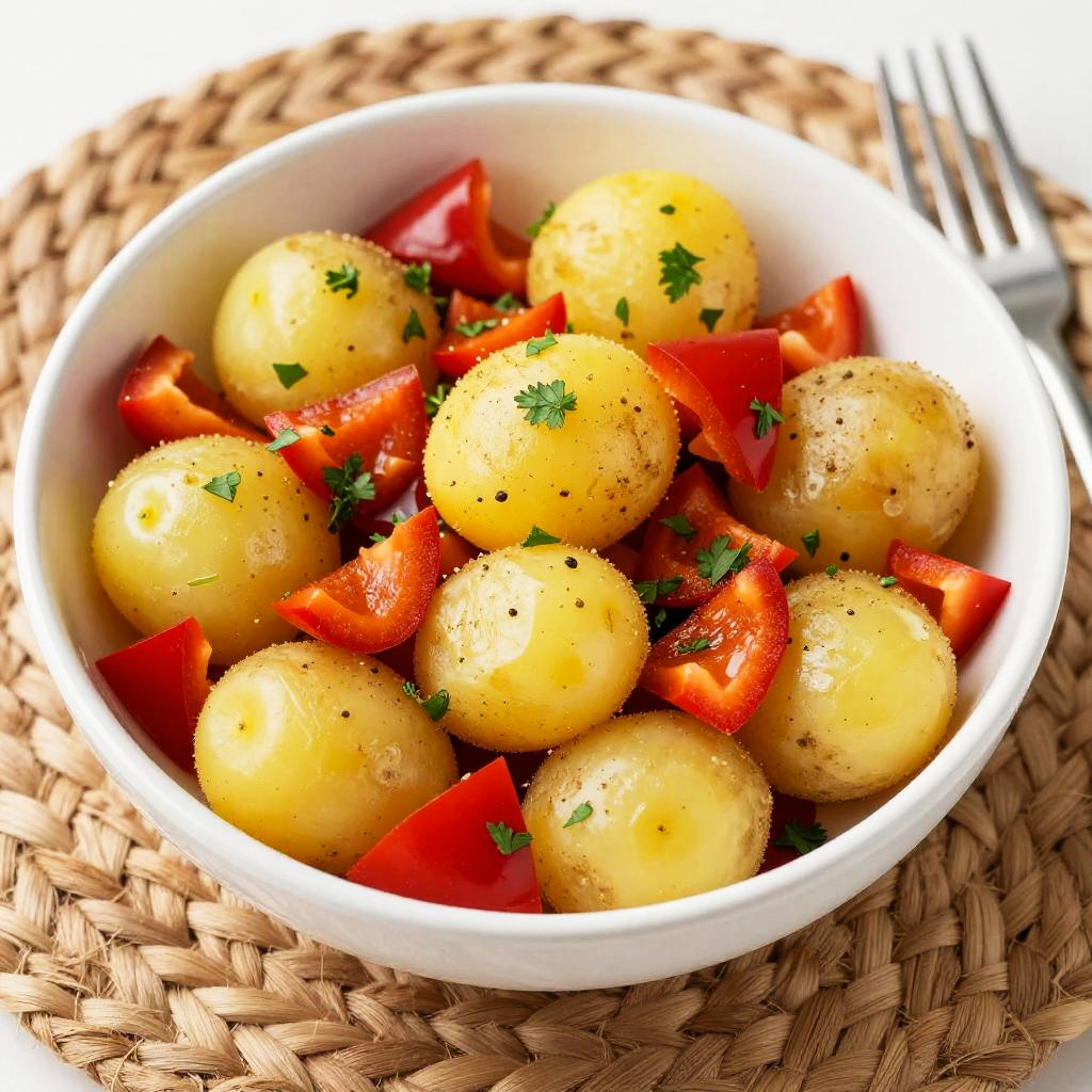 Photograph of a vibrant, colorful salad in a white bowl. The salad consists of small, yellow boiled potatoes mixed with bright red bell pepper chunks and garnished with fresh green parsley leaves and black pepper. The bowl sits on a woven, circular placemat, and a shiny metal fork is placed to the right. The image has a warm, appetizing feel.