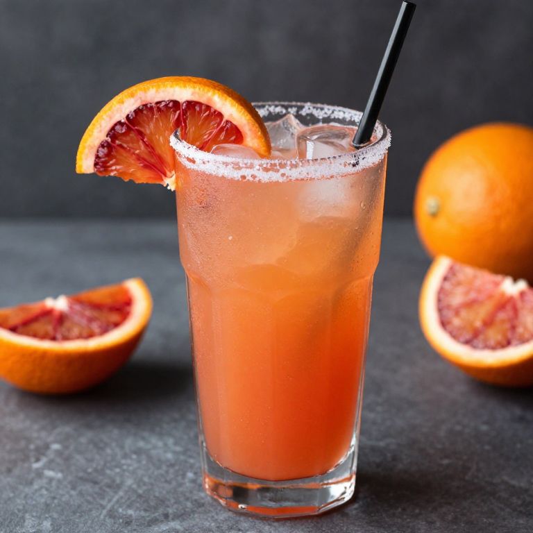 Two vibrant blood orange margaritas, garnished with fresh orange slices and ice cubes, sit side by side in clear glass tumblers on a rustic white surface, with one slightly blurred in the background.