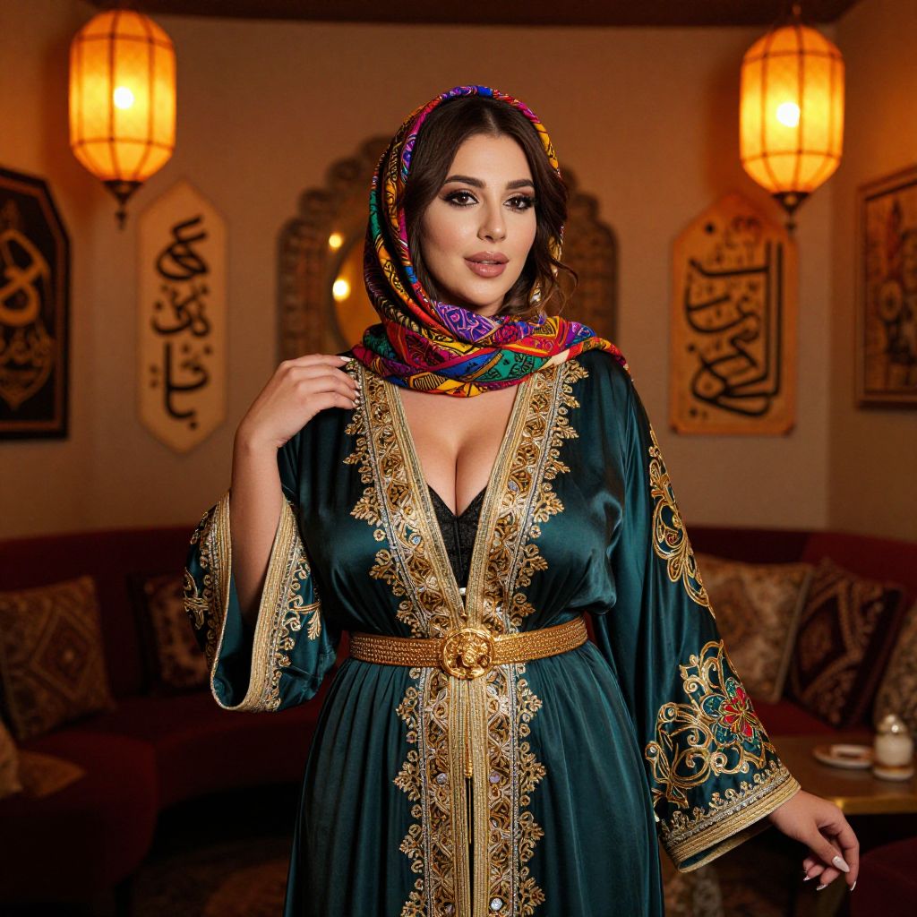 A bold and radiant ethnic wear woman at a festive night party in a traditional Moroccan djellaba with intricate embroidery and a golden belt, wearing a headscarf with colorful patterns, standing in a cozy, warm room with glowing orange lanterns and Arabic calligraphy on the walls, exuding charm and confidence.. The woman has big tits and cute face