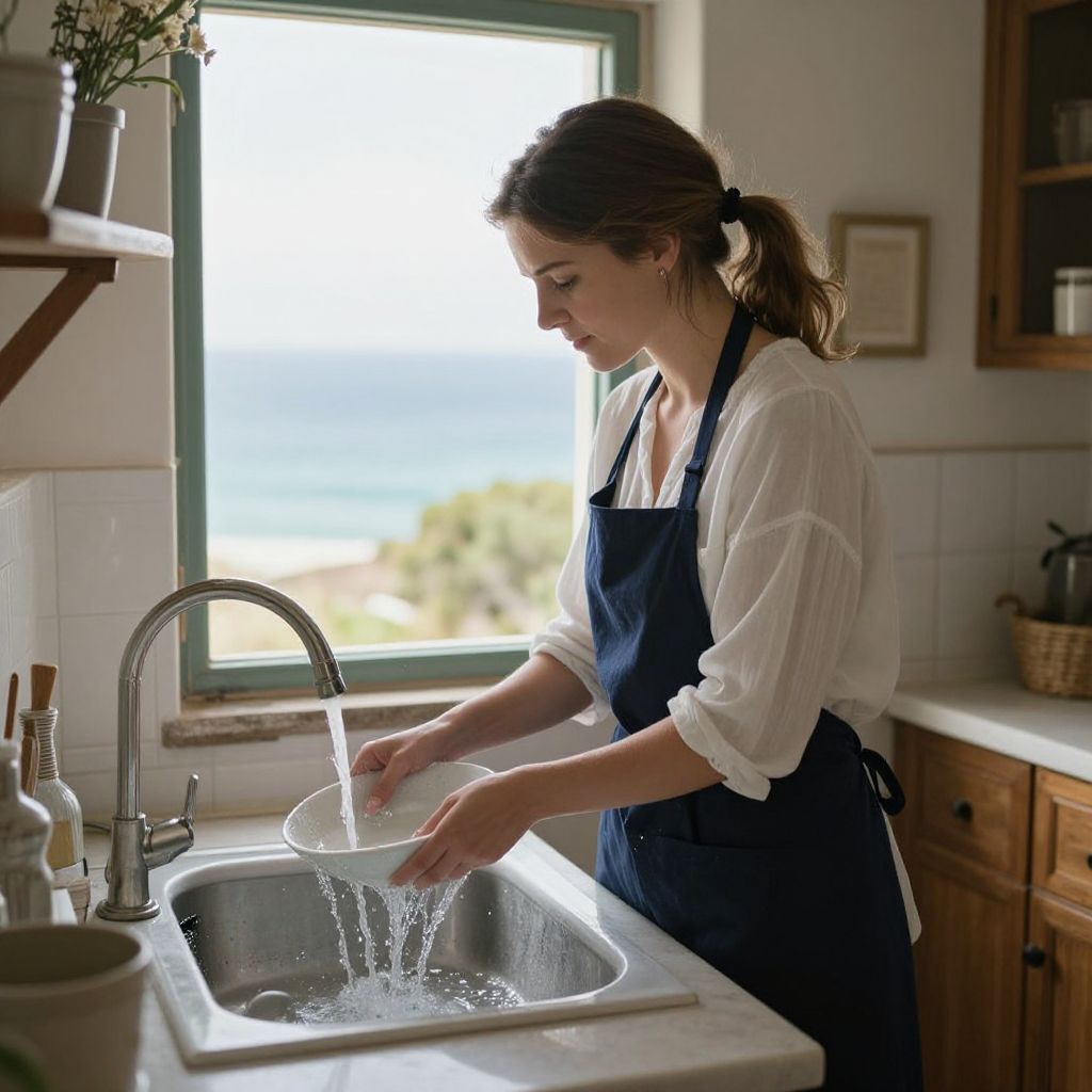 Woman washing dishes in a rustic kitchen, wearing a white blouse and navy apron, with a serene coastal landscape visible through the window behind her.