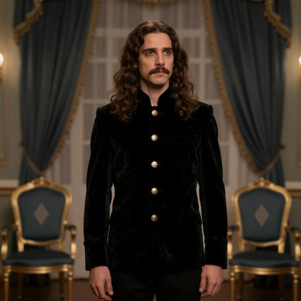 Man with long, wavy brown hair, dark mustache, wearing black velvet jacket with gold buttons, stands in ornate room. Three gold-accented blue chairs with diamond patterns in background. Dark curtains with gold trim. Man looks to the side with serious expression. Dim, warm lighting.