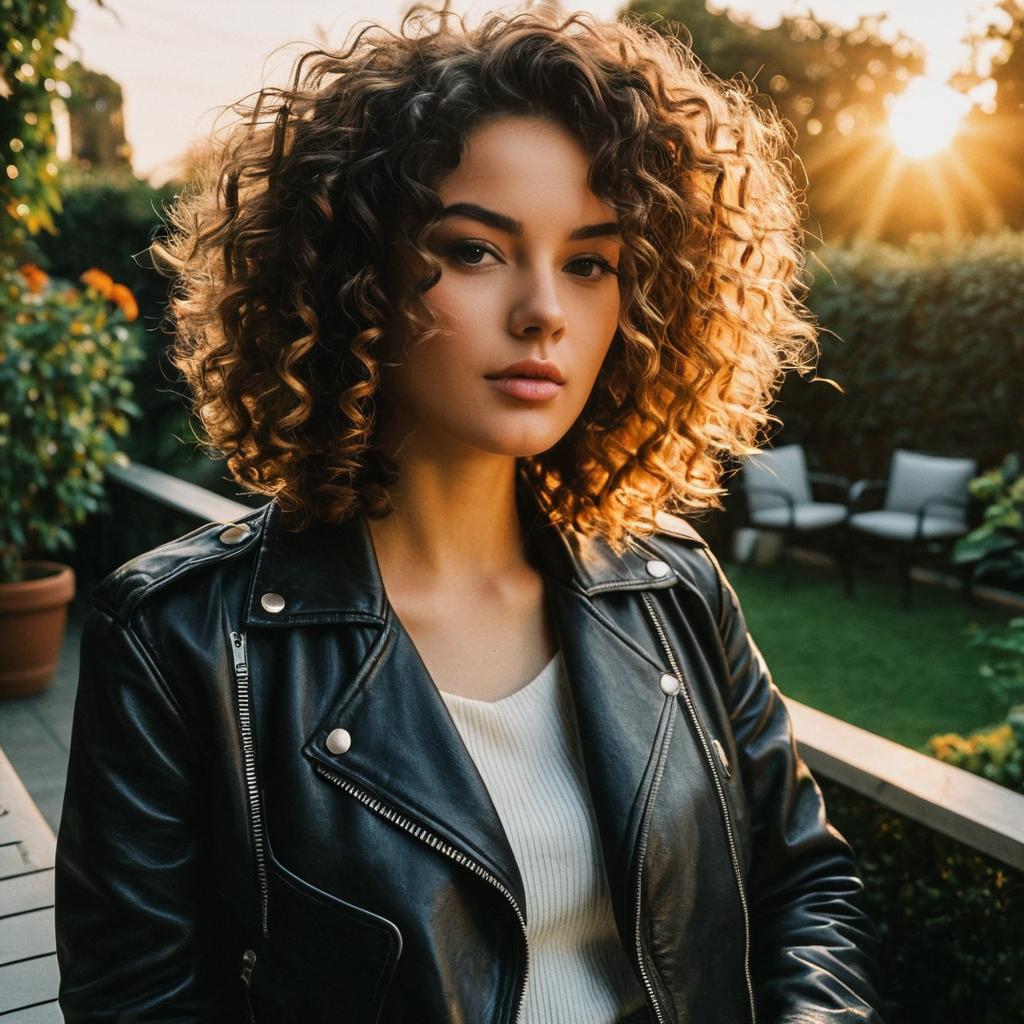 Curly Ponytail hairstyle on young woman, wearing leather jacket and denim jeans, in garden, captured in fashion editorial style with warm sunlight.