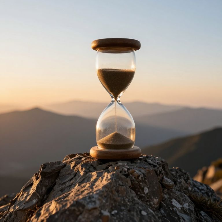 Stacked hourglasses stand sentinel atop a rugged mountain peak, their sands flowing backward as dawn's golden light casts elongated shadows across the serene landscape.
