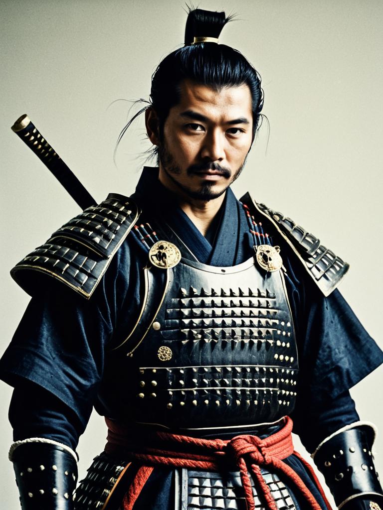 Man in Samurai Costume, waist-up editorial portrait, photorealistic tones