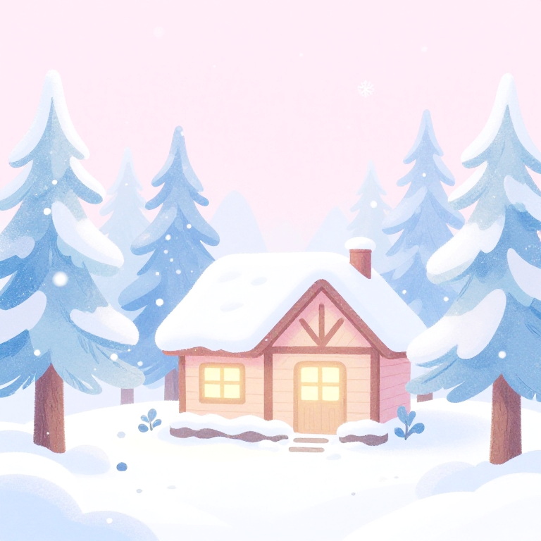 A digital drawing in a whimsical, cartoon style depicts a cozy, snow-covered cottage with a pinkish-beige facade and a triangular, brown roof. The cottage has two lit windows emitting a warm yellow glow, contrasting with the white snow. Surrounding the cottage are tall, snow-laden evergreen trees, their blue and white hues blending with the snowy ground. The background is a simple, white sky, emphasizing the bright, wintry scene. Small, dark brown tree trunks and a few snow-covered bushes are visible in the foreground.