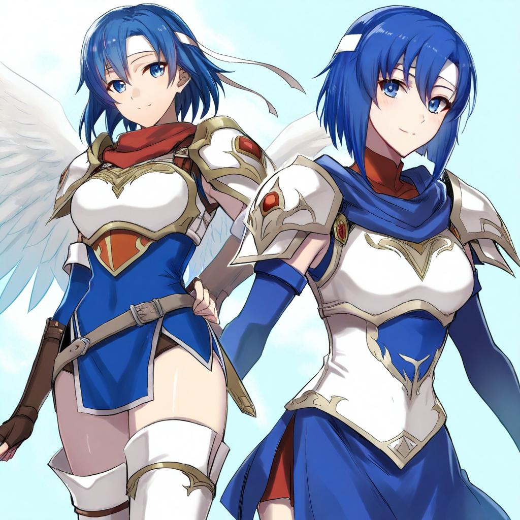Digital illustration featuring Catria, a female character from Fire Emblem, depicted twice in detailed Pegasus Knight armor. She has blue hair, blue eyes, and wears a white headband. Her armor is a combination of white, blue, and gold with red accents, and includes elbow-length fingerless gloves. The background is light with a subtle sky effect, and one version of her character has white wings.