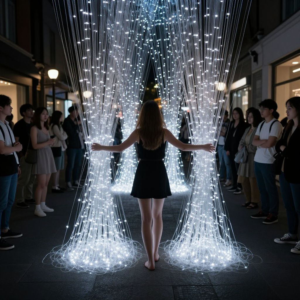 A woman stands barefoot between two illuminated, translucent strands of light, extending her arms as if weaving through a mesmerizing display of glowing, fiber-like structures that stretch across a dark urban street, captivating onlookers who gather around the surreal installation.