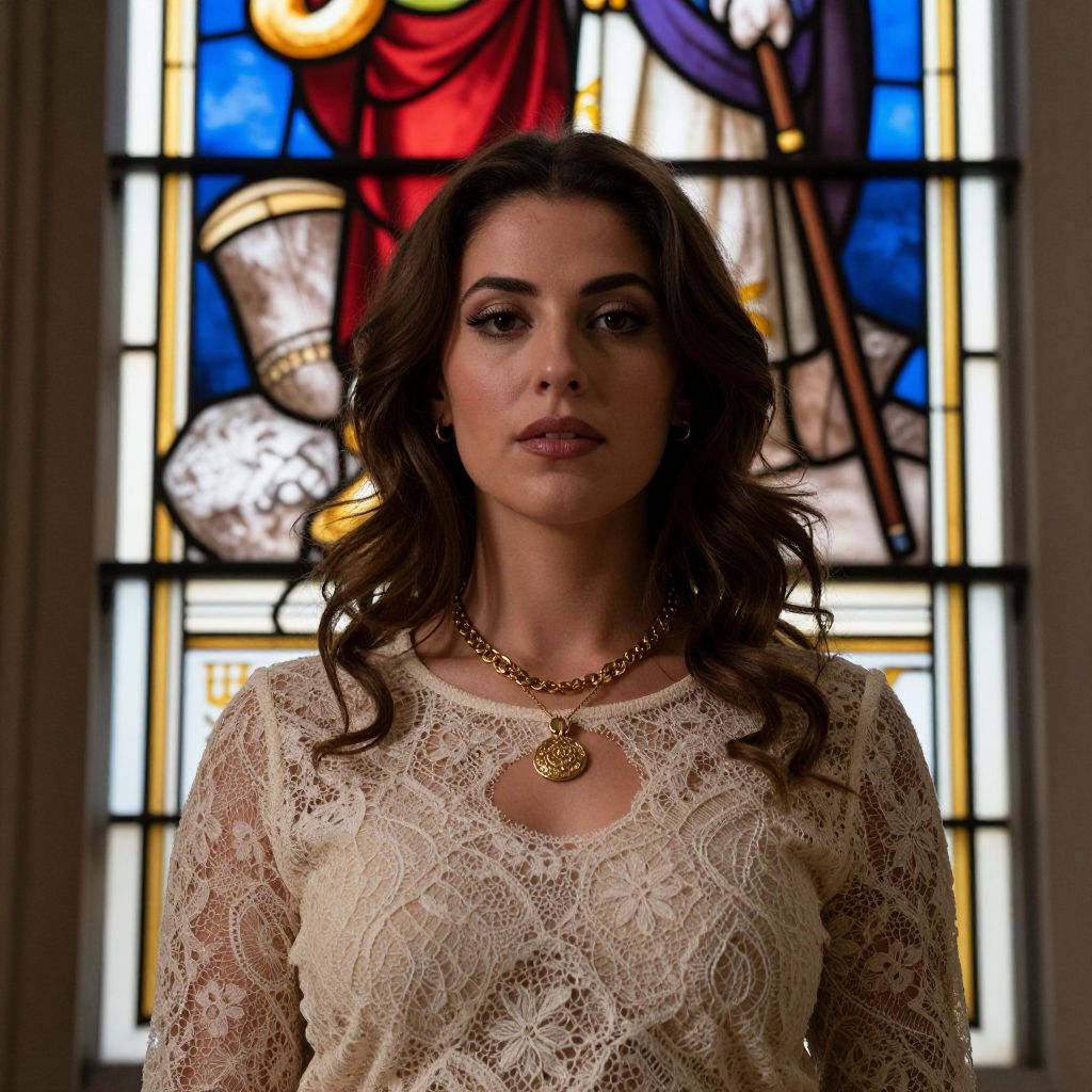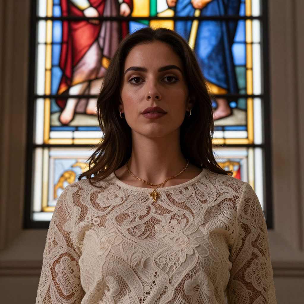 Photograph of a woman with olive skin and dark brown, wavy hair, standing in front of a colorful stained glass window. She has dark, arched eyebrows, brown eyes, and full lips. She wears a white, lace long-sleeve top with intricate floral patterns and a thin gold necklace with a small pendant. The stained glass window behind her features vibrant colors, including red, blue, and yellow, depicting figures in traditional clothing. The lighting casts a soft glow on her face, highlighting her serious expression. The background is slightly out of focus, emphasizing her as the central subject.