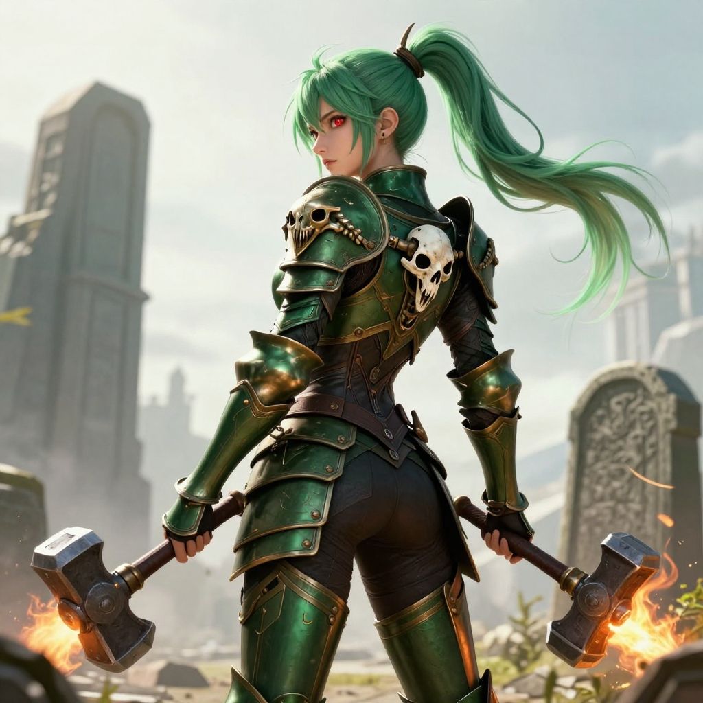 Digital art of a green-haired warrior woman in green armor with skull motifs, holding dual flaming hammers, standing in a ruined, sunlit cityscape