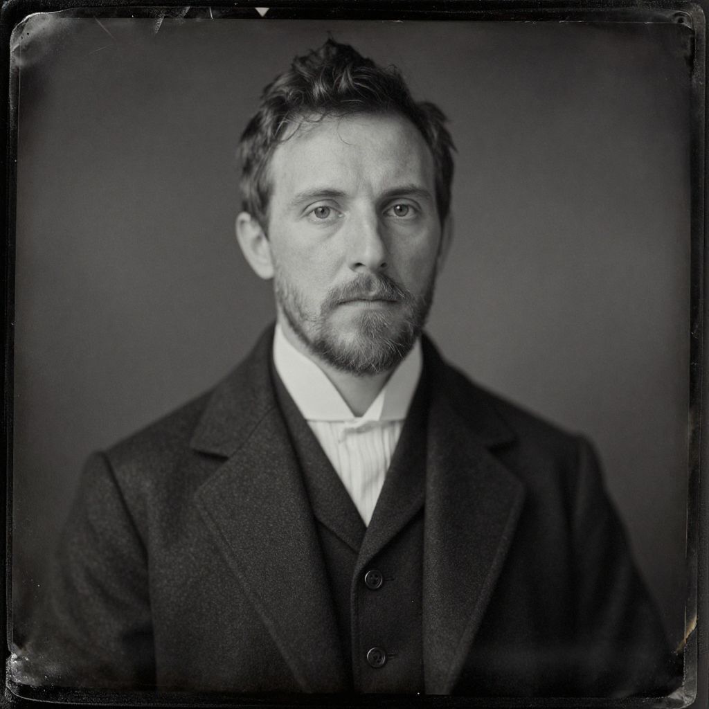 Black-and-white photograph of a serious-looking Caucasian man with short, slightly tousled dark hair and a trimmed beard. He wears a dark, textured woolen blazer over a white shirt with a high collar. The background is a smooth gradient, fading from dark to light, and the image has a vintage, slightly worn border with visible scratches. The man's piercing eyes and solemn expression give him a dignified, timeless appearance. The photograph's high contrast and sharp focus emphasize his facial features and formal attire.