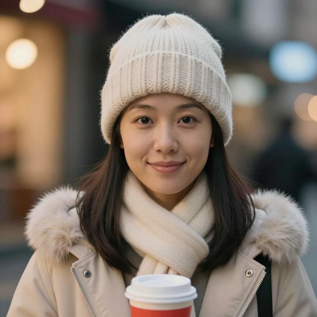 Portrait of a young Asian woman with medium-length brown hair and natural makeup sitting inside a modern commuter train. She is wearing a teal cardigan over an orange top, gazing thoughtfully away from the camera. The train interior features orange and teal seats, with blurred background emphasizing the subject in focus.