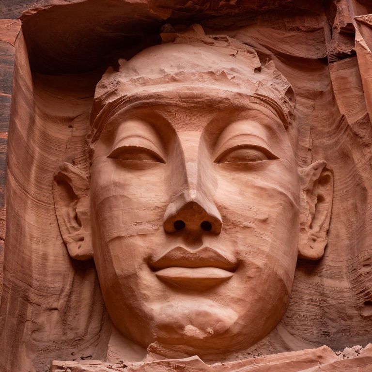 Photograph of a detailed, carved sandstone bust with a serene, smiling face, featuring smooth textures and rough edges, set against a reddish-b