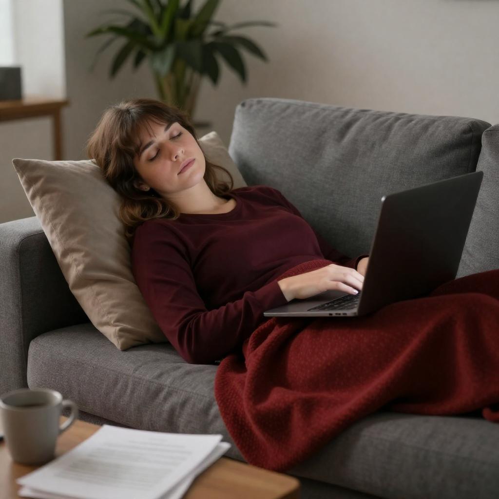 Photograph of a woman with dark hair and glasses, lying in a blue sleeping bag with an orange hood, and a red sleeping bag beside her. She wears a colorful floral top, with her hands resting on the red sleeping bag. They are on green grass.