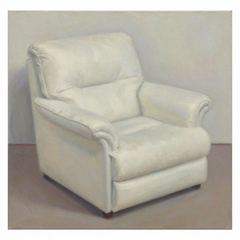 Original fine art oil painting titled 'Soft Comfort' by Joy Olney. The painting features a single cream-colored armchair with soft, inviting cushions in a minimalist setting, rendered in oil on canvas. The dimensions are 12x9 inches.