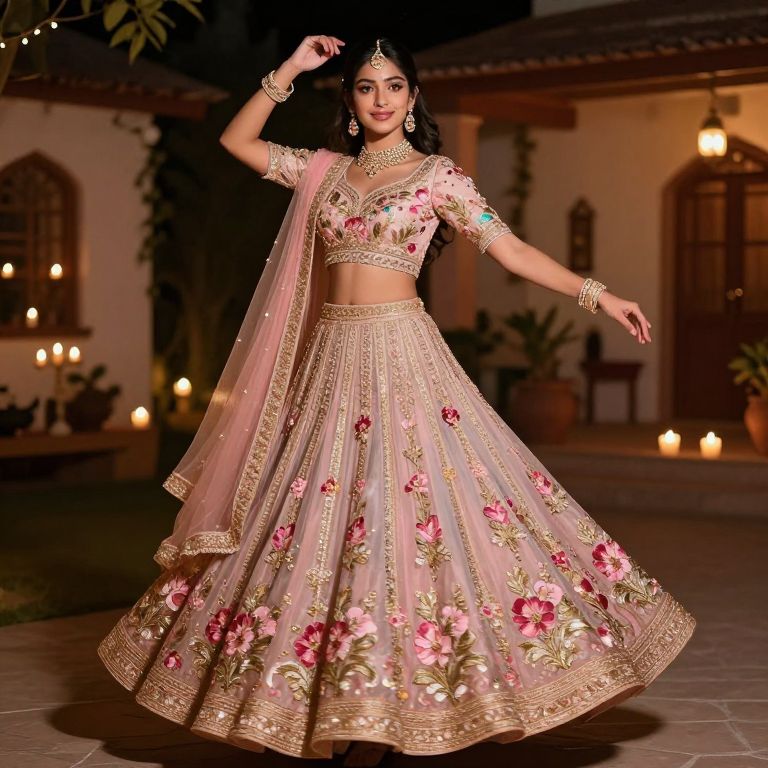 A graceful girl with fair complexion and large, expressive eyes wearing a festive tulle lehenga with pastel pink and gold floral patterns, posing in a candlelit courtyard during an evening celebration with traditional dance in motion.