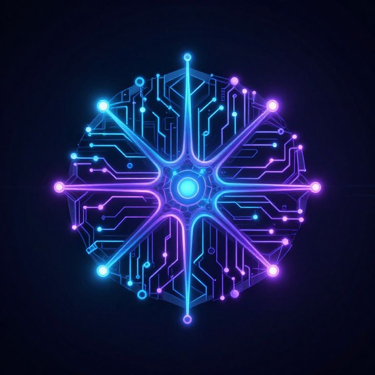 This digital artwork features a neon, glowing, circular design set against a black background. The central hub is bright blue, surrounded by intricate, neon blue and purple circuit-like lines extending outward in a starburst pattern, with small glowing blue and purple dots at the tips. The overall effect is cybernetic and futuristic, with a high-tech, electronic feel. The lines and dots are sharply defined, creating a sense of depth and complexity. The image has a vibrant, luminous quality, resembling a digital circuit board or a stylized representation of a neural network.