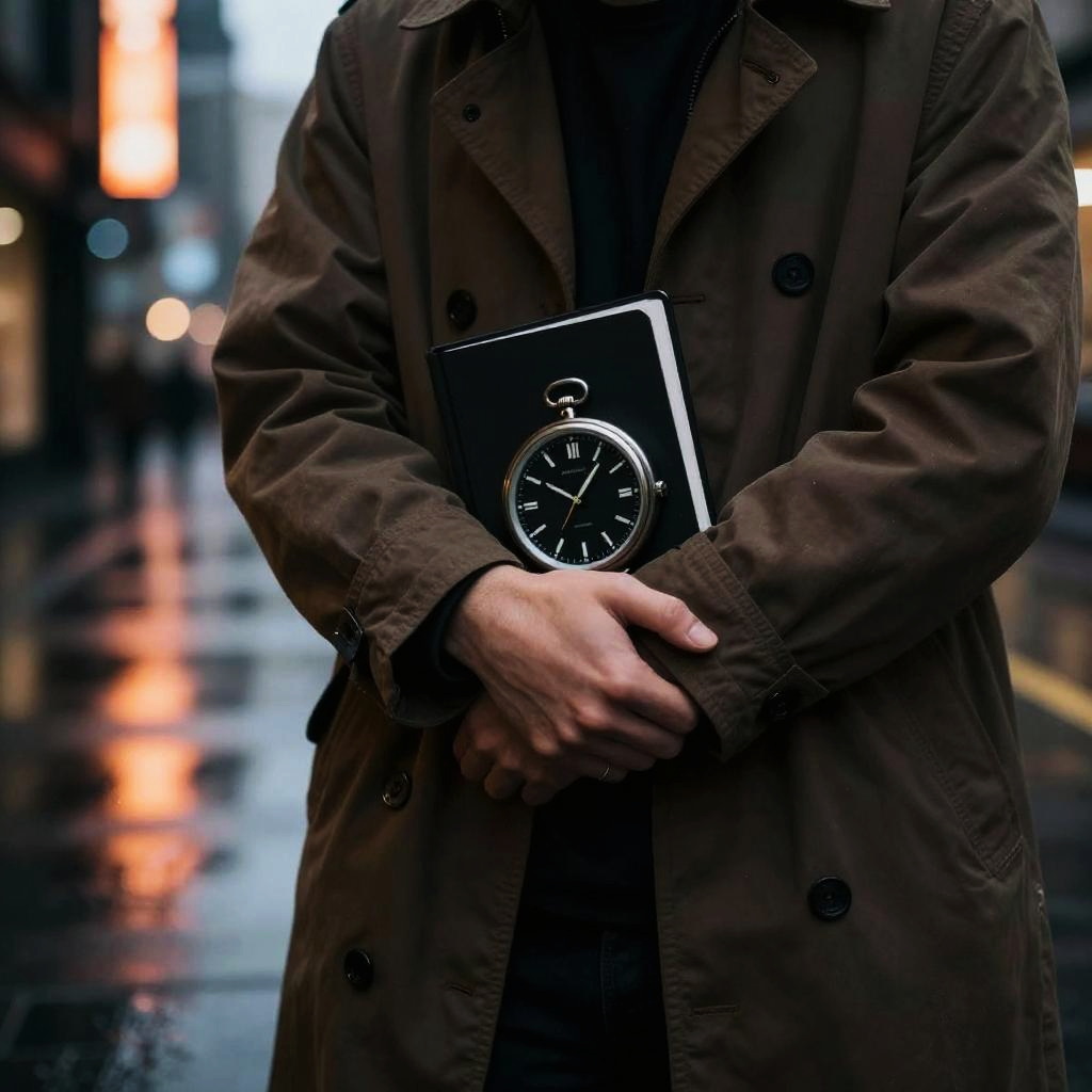Photograph of a person from the neck down, wearing a dark brown, double-breasted trench coat. They are holding a black leather-bound book with a silver pocket watch on the cover in front of them, clasped in their hands. The background is a blurred city street with wet pavement, reflecting colorful lights, suggesting a nighttime urban setting. The coat's fabric appears slightly textured, and the pocket watch is prominently shiny. The overall mood is mysterious and sophisticated.
