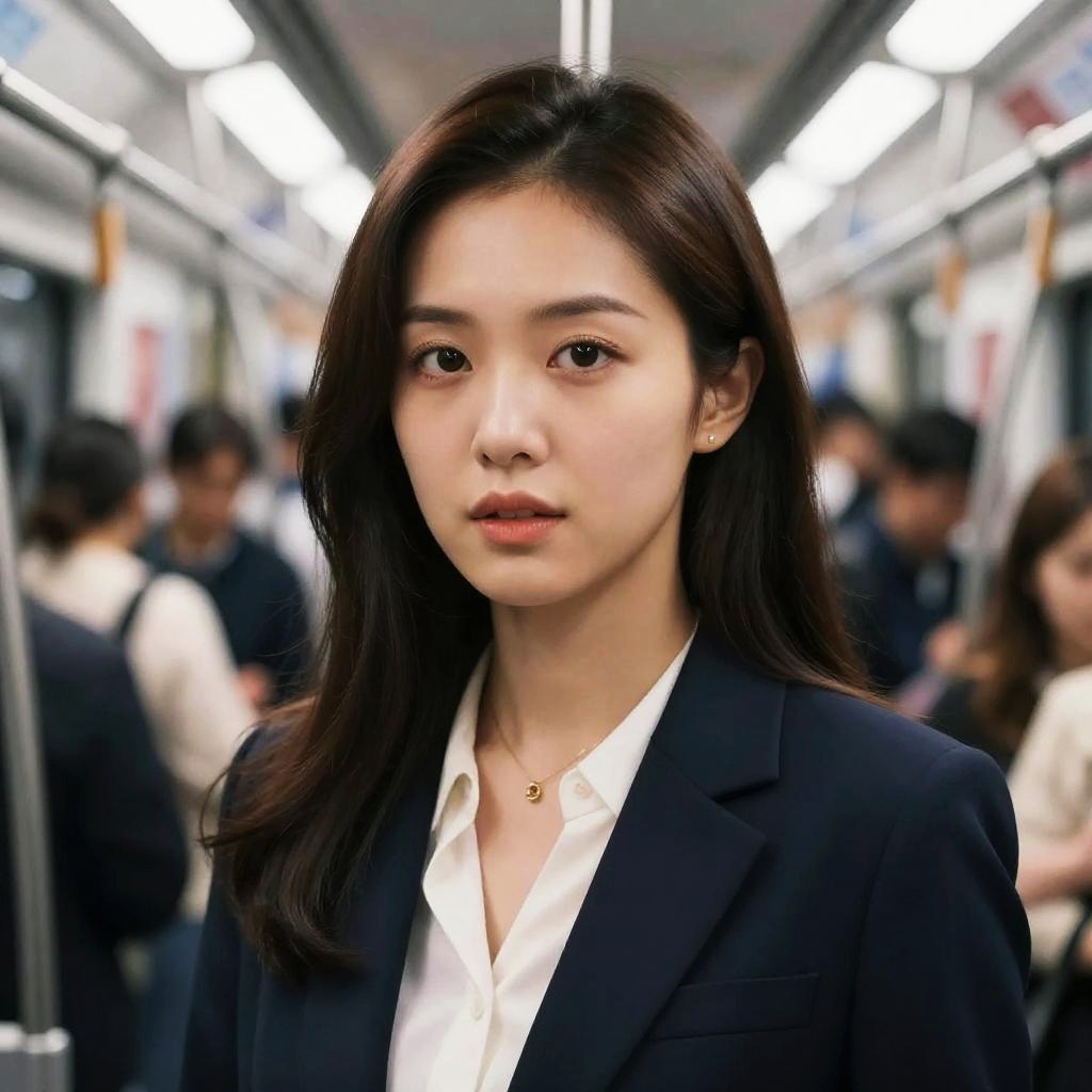 Photograph of a busy subway car with fluorescent lighting. Central focus is on an Asian woman with long black hair, wearing a grey blazer, white blouse, and grey pants, standing and holding a pole. She looks forward with a neutral expression. Surrounding her, other passengers sit and stand, including a woman in a white shirt and black skirt on the left and a man in a black shirt on the right. The subway car has grey seats and overhead signs. The background is slightly blurred, emphasizing the central figure. The overall style is candid and realistic.