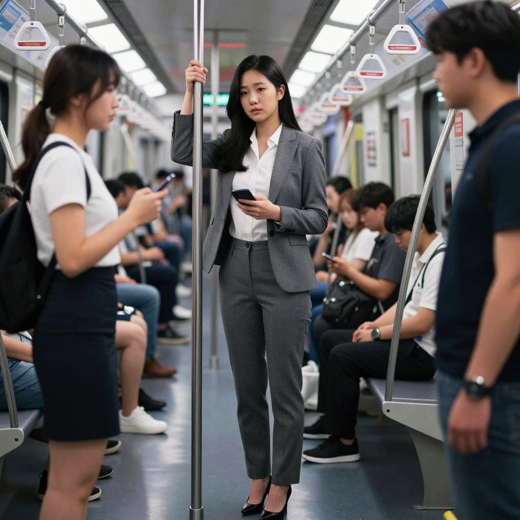 Photograph of an Asian woman in a grey suit and black heels holding a subway pole, standing amidst seated commuters. The background features brightly lit train interior