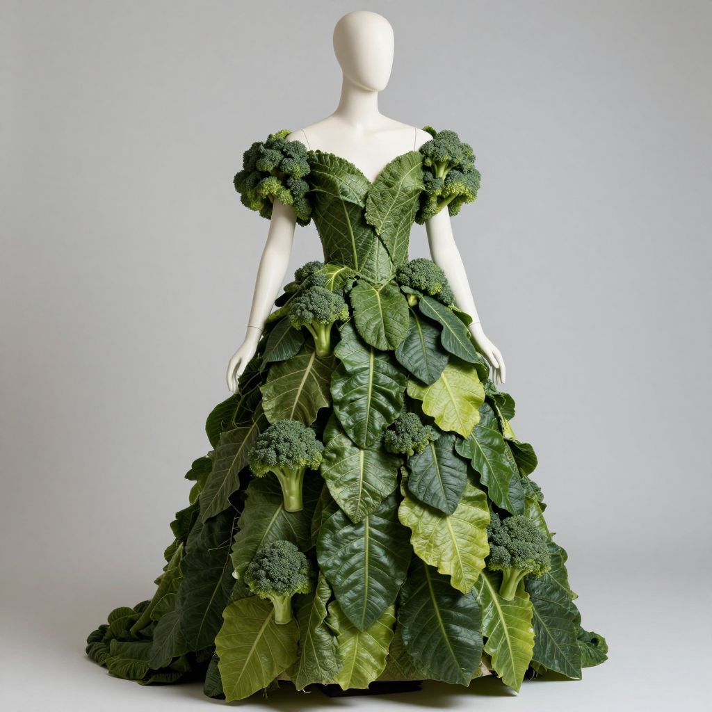 Photograph of a detailed sculpture depicting a green-skinned man with leaf-like armor. The man has a serious expression, with leaves covering his head like a crown and layered over his shoulders and chest. His hands, also leaf-covered, rest on his lap. The sculpture is monochromatic green, with realistic textures and veins on the leaf armor. The background is a solid, muted gray, highlighting the intricate design of the sculpture. The overall style is realistic with a nature-inspired theme.