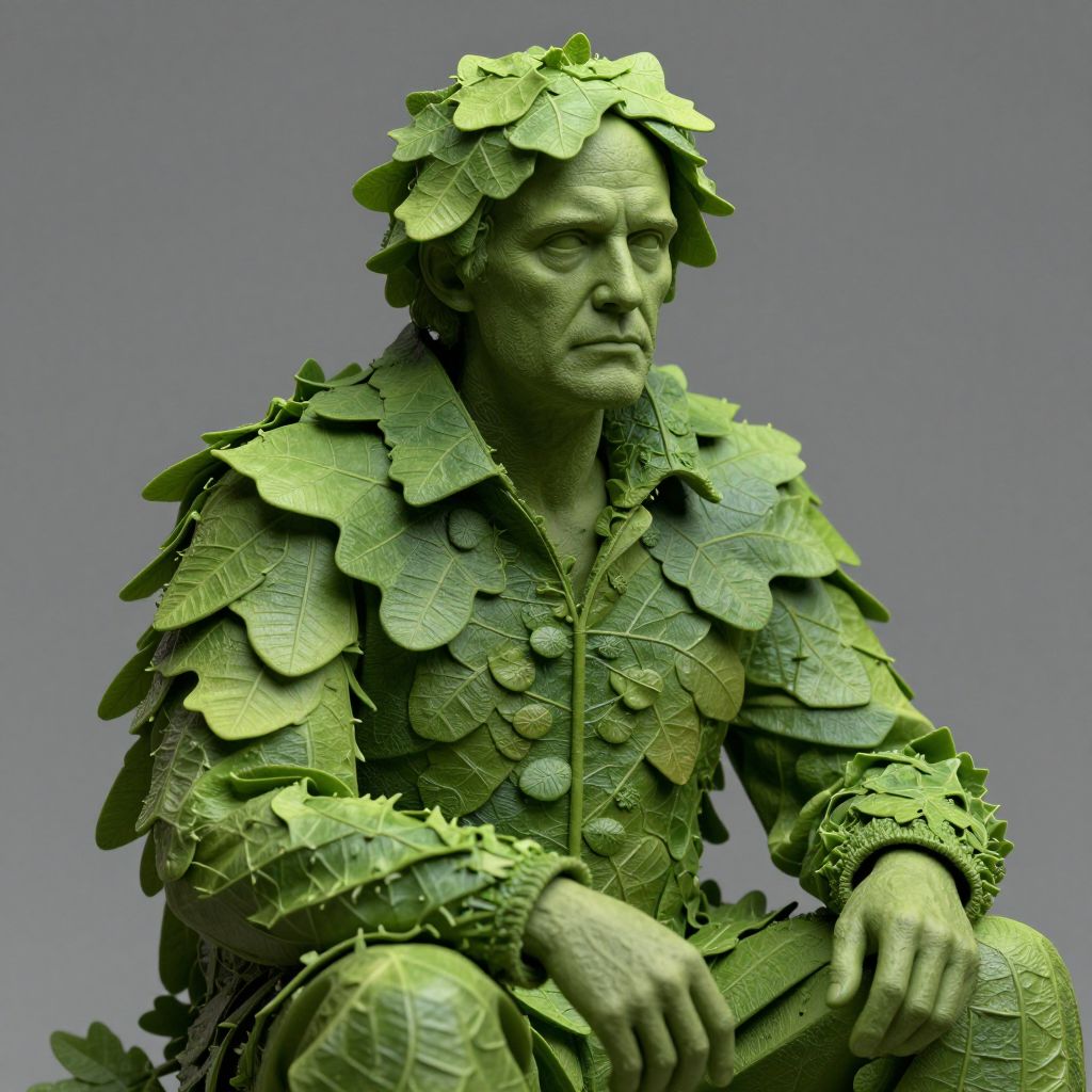 Photorealistic digital sculpture of a serious, green-skinned man with leaf-like armor, seated against a grey background, resembling nature.