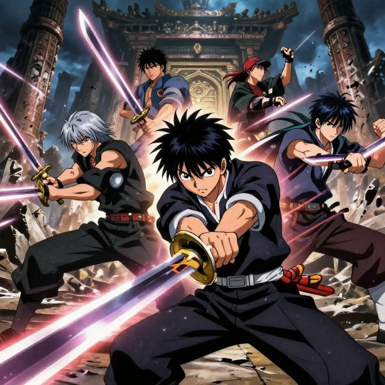 Anime style AI image generator producing an intense battle scene, characters wielding glowing swords, dramatic lighting effects, highly detailed backgrounds with ruined temples, capturing the energy and emotion typical of shonen anime, enhanced with AI-powered texture refinement.