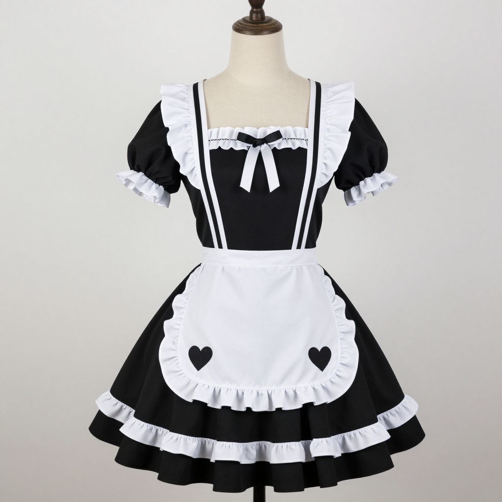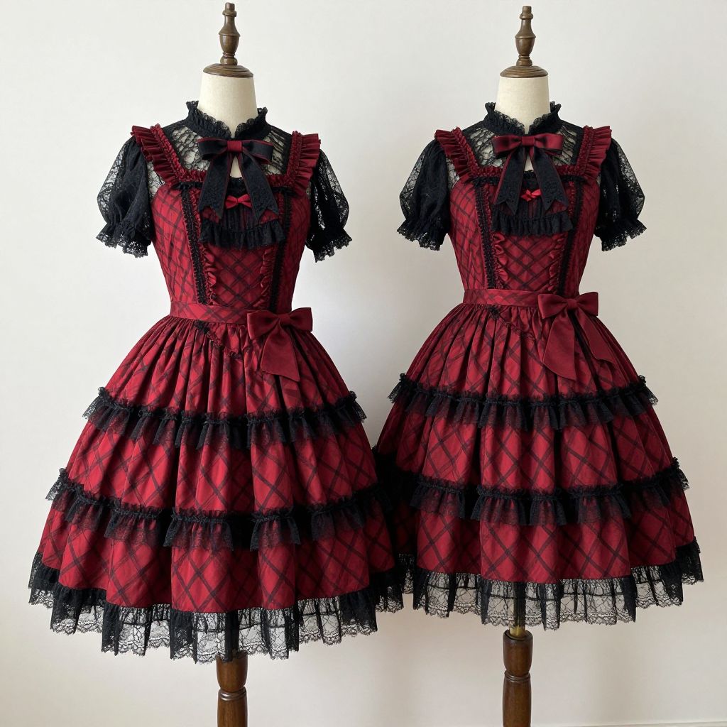 Photograph of a black and red corseted tutu dress with heart-shaped buttons, layered tulle, and gold trim, displayed on a white
