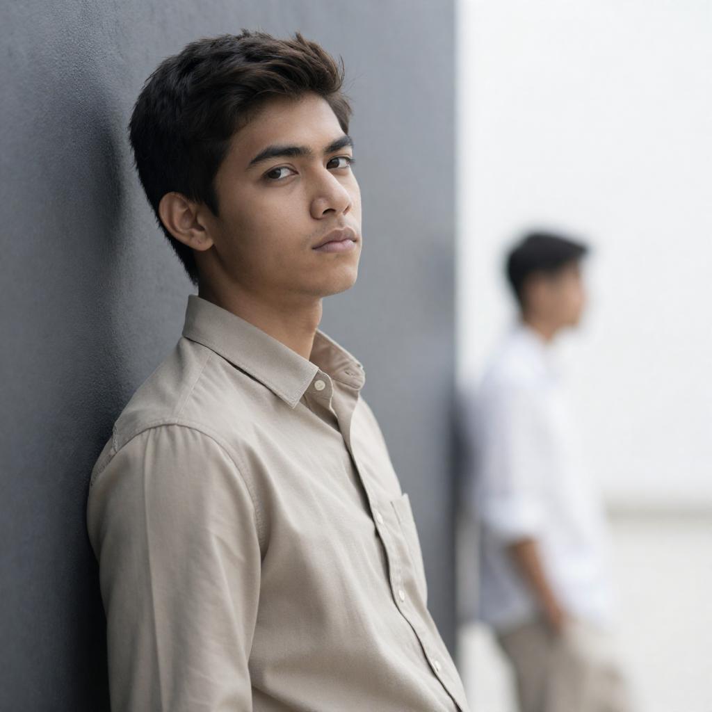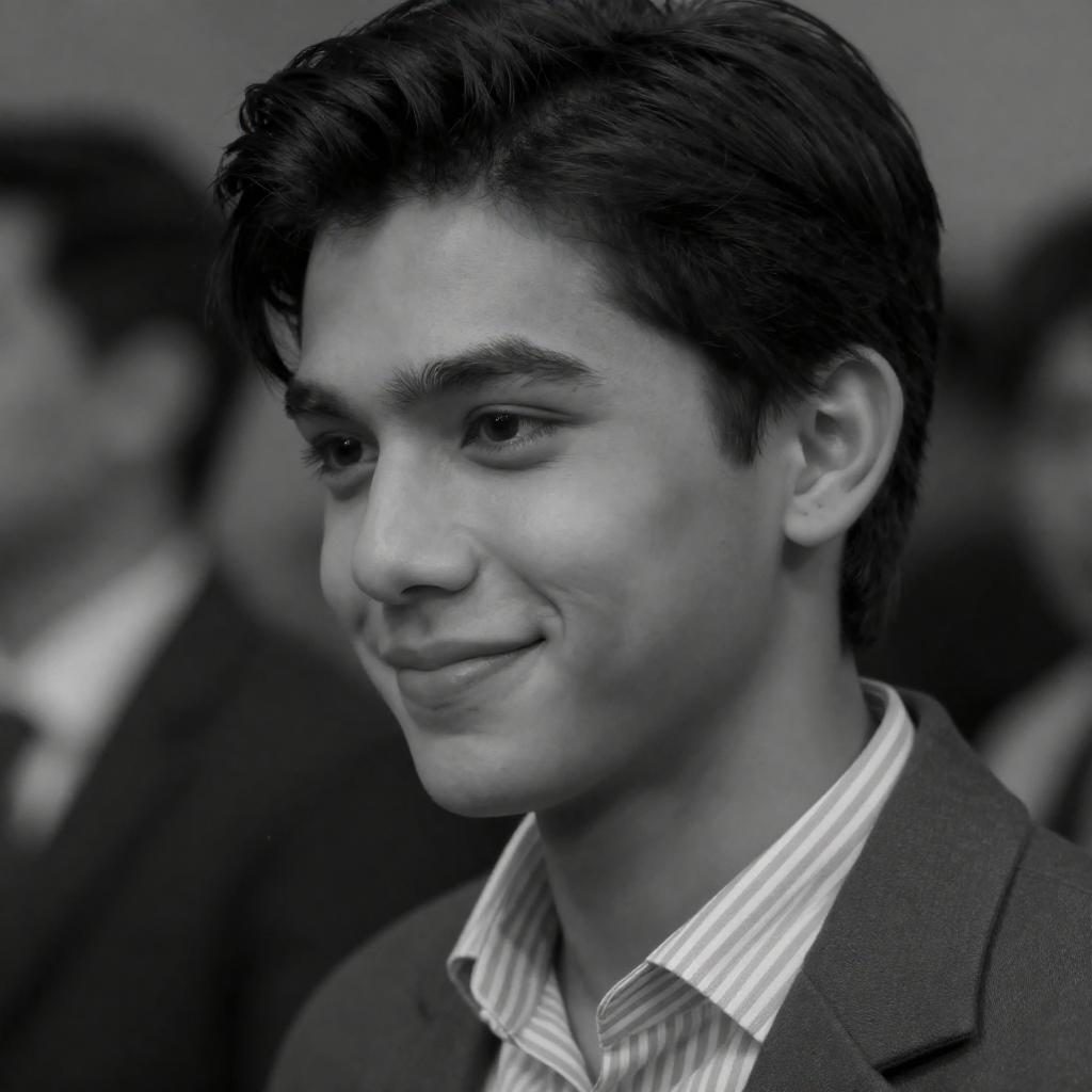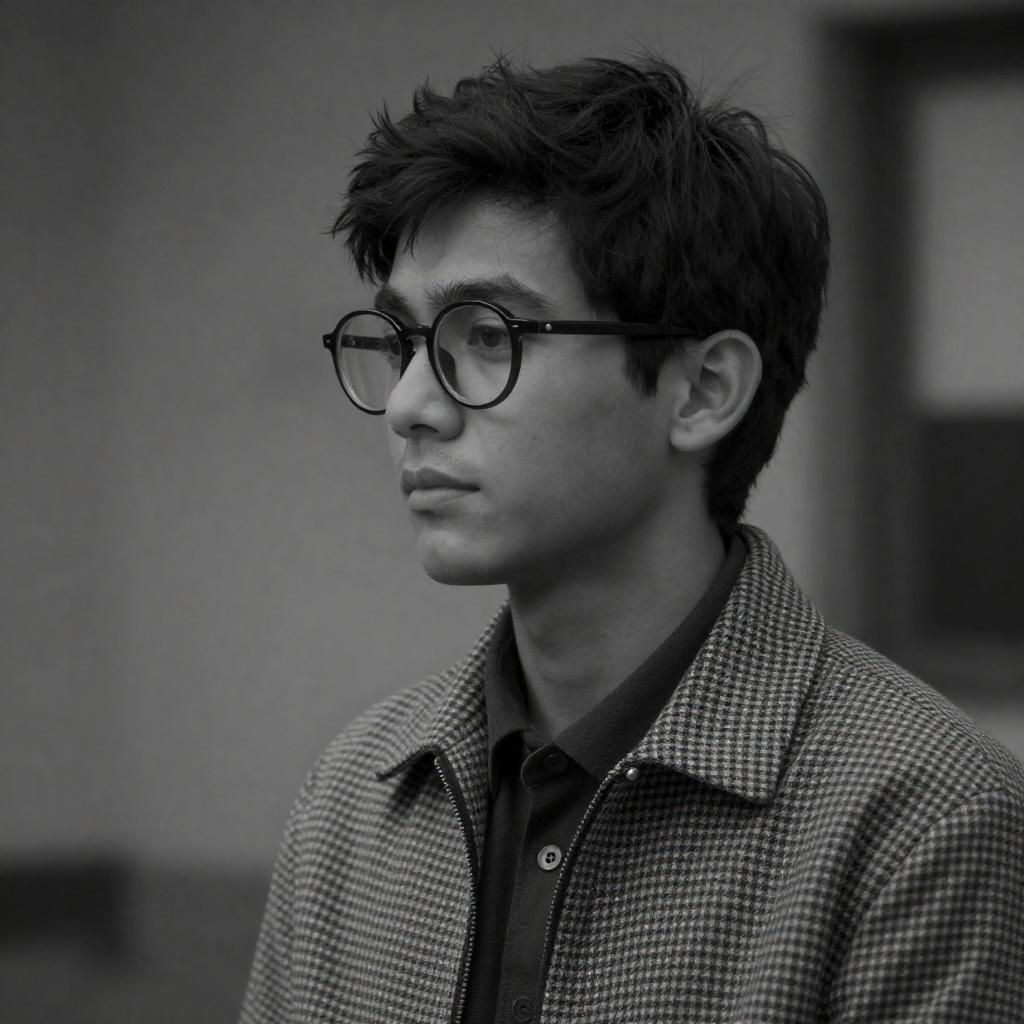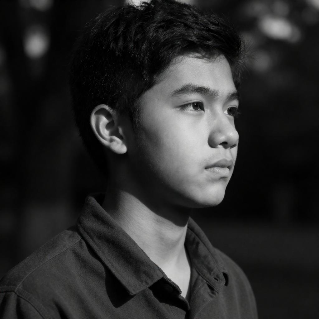 Black-and-white photograph of a young man with short, dark hair, wearing a collared shirt, looking to the right. High contrast highlights his face and shadowed background, creating a dramatic effect. The background is blurred with tree-like shapes.