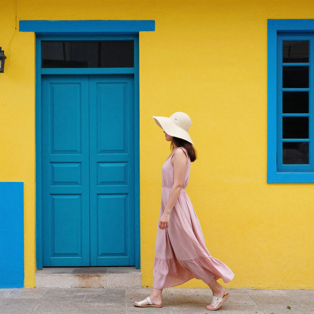 Woman wearing a wide-brimmed straw hat and flowing pink dress strolls gracefully past a vibrant wall divided by bold yellow and blue sections, featuring a teal double-door and matching window frame.