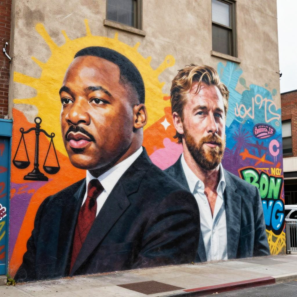 Martin Luther King and Ryan Gosling depicted as inspirational figures on a mural wall, graffiti art style with bold colors, urban setting, highlighting themes of justice and hope