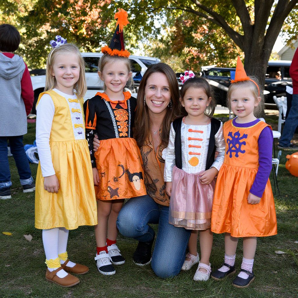 Wendy Mitchell captures a joyful family moment at New Milford's Trunk or Treat event on Thursday, October 31, 2013, featuring a smiling woman kneeling beside three children dressed in colorful fall attire, with trees and parked cars visible in the background.