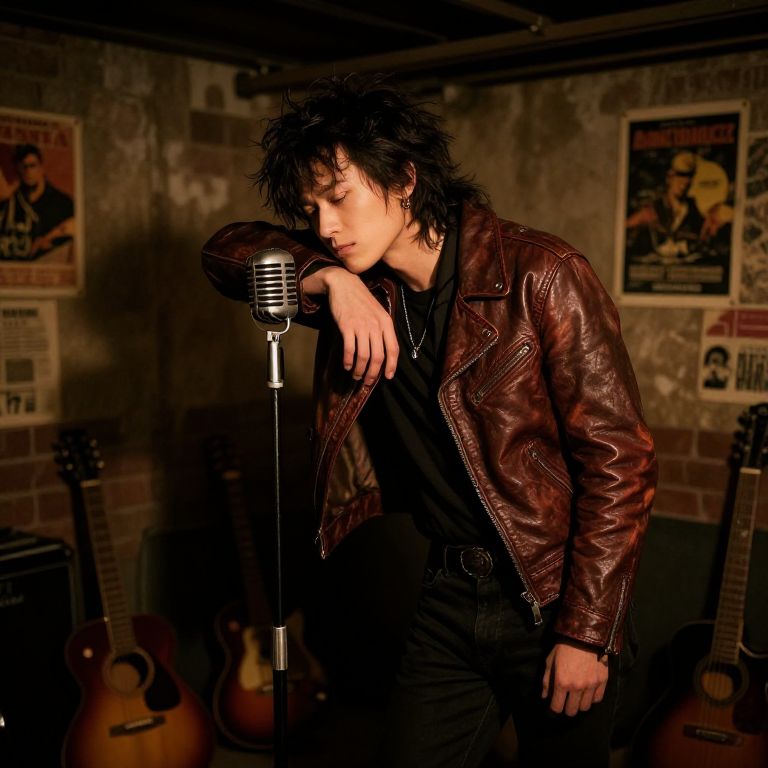 Rocstar in vintage leather jacket with wild hairstyle, leaning on an old microphone stand in a dimly lit grungy garage, surrounded by classic rock instruments, faded posters on brick walls, moody shadows and warm tones, atmospheric and nostalgic vibe