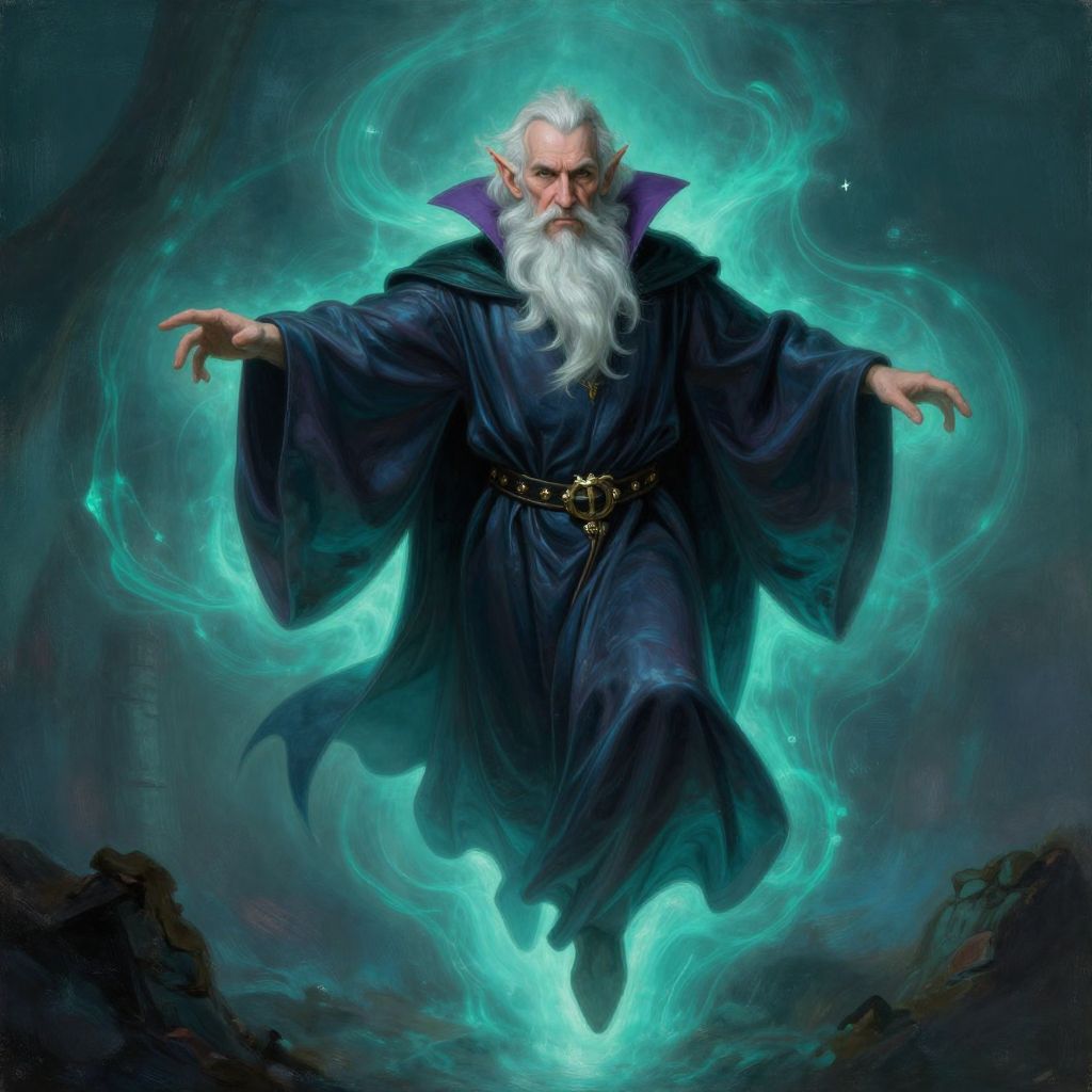 Digital artwork of a fierce, white-bearded wizard with pointed ears, floating in a dark, mystical forest, surrounded by glowing blue magical energy.