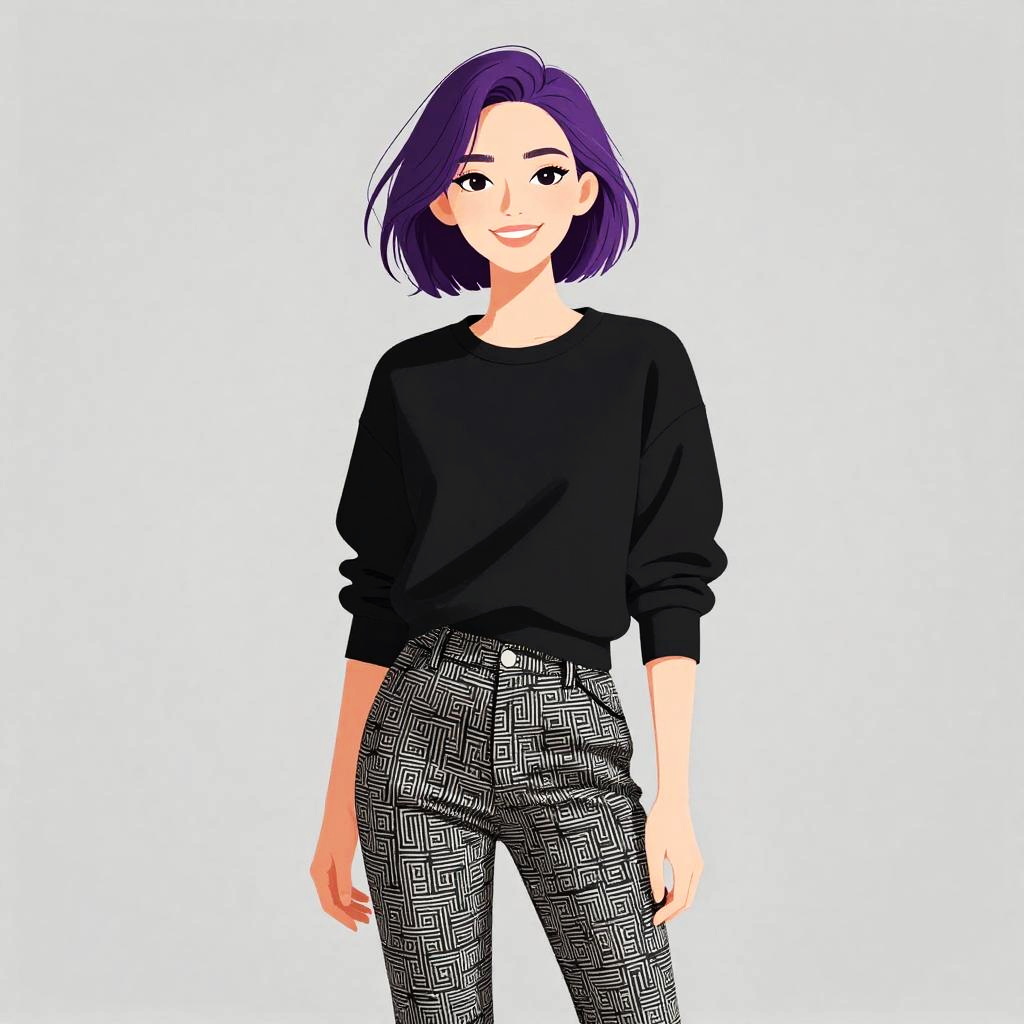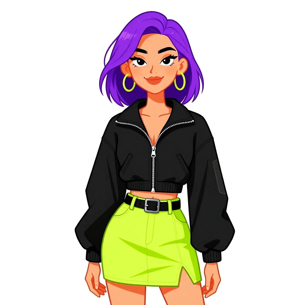 Woman with pretty face and pretty hair. smiling Woman, urban chic, black shearling jacket with oversized lapels, zippered front, belted cuffs, layered over white asymmetrical hem dress, ribbed texture, turtleneck, sheer details, mid-thigh length, grey photo studio background --sref 1467