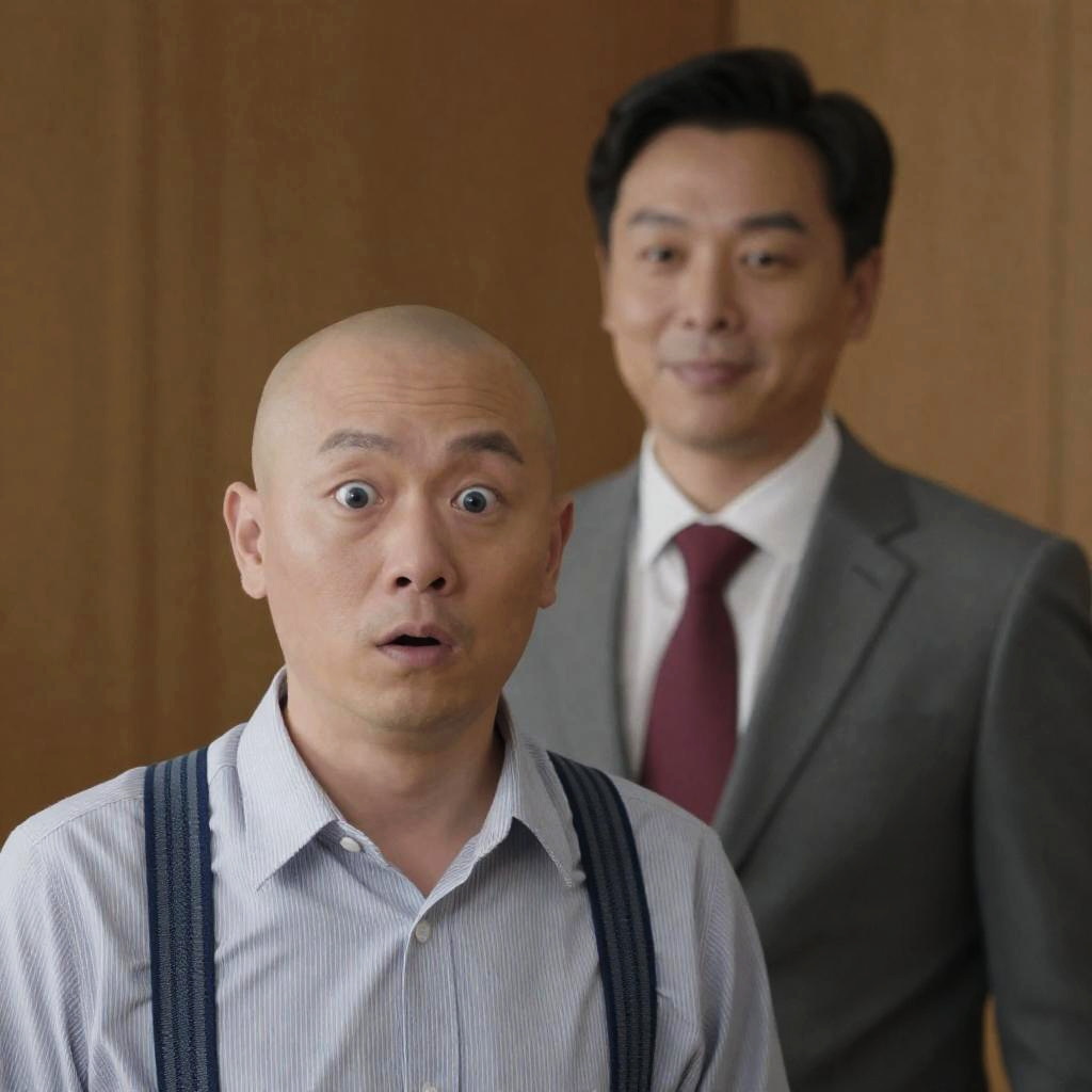 Old man in black vest and white shirt, open mouth in shock, standing. Man in gray suit, back to camera, head exploding with fire and sparks. Dimly lit living room with beige couch and brick wall. Two people. Intense expressions.