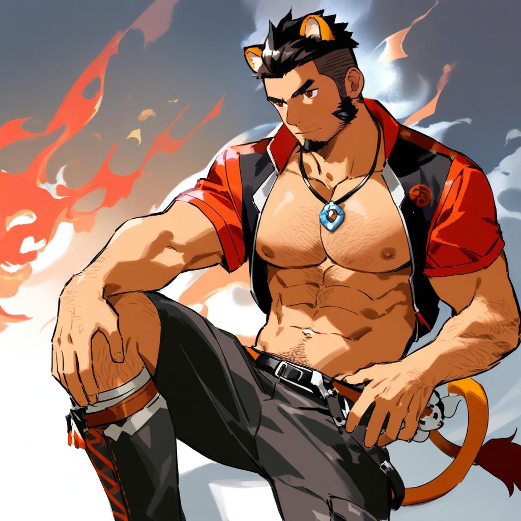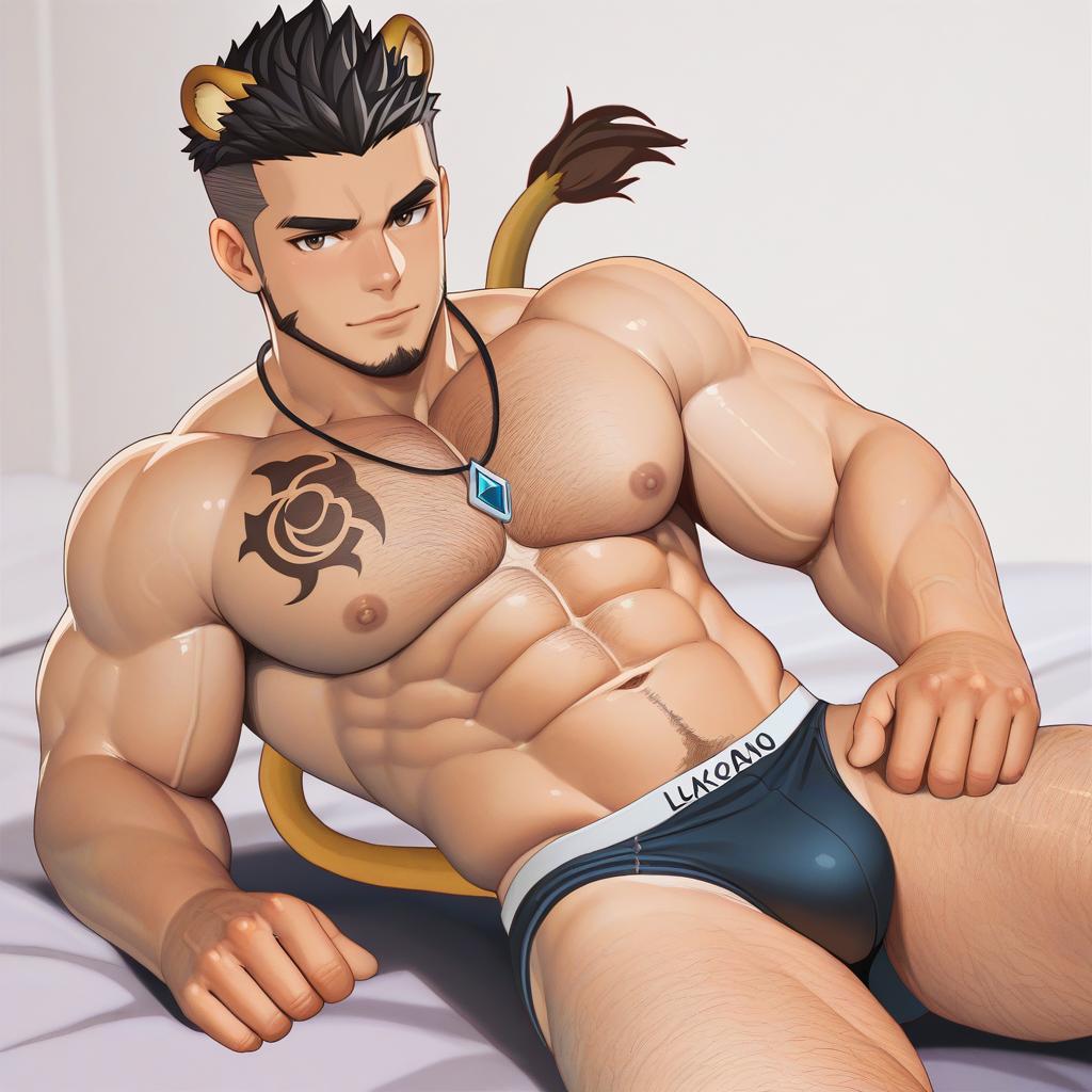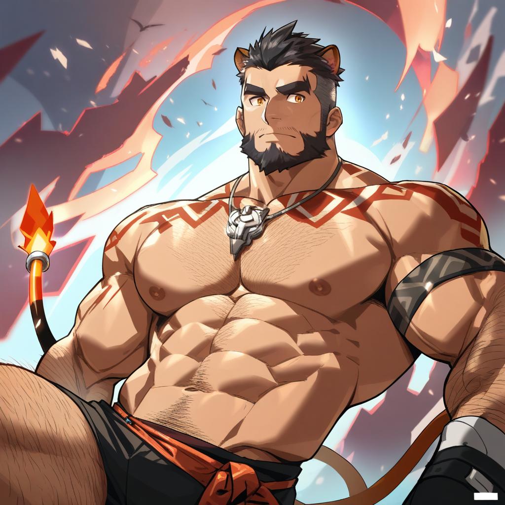 Alca (wakatanka4), gyee, 1boy, lion boy, mature male, lion ears, beard, lion tail, extra ears, red eyes, thick eyebrows, short hair, black hair, navel hair, chest hair, leg hair, chest tattoo, nipples, thick thighs, navel, necklace, bara, muscular male, large pectorals, abs, undercut, sideburns, stomach, by artist aruman, illustrious