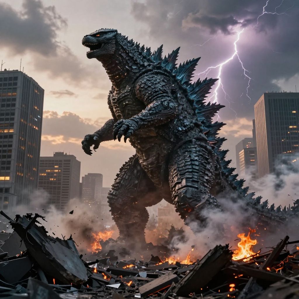 Godzilla destroyed city scene at dusk, towering monstrous figure amidst crumbling skyscrapers, billowing smoke, glowing fiery ruins, dramatic lightning in the smoky sky, cinematic atmosphere, hyper-realistic urban devastation, intense chaos and destruction