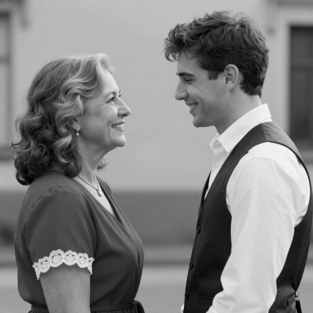 Black-and-white photograph of a smiling young man in a white shirt and dark vest facing an older woman with wavy hair, wearing a dark dress with lace cuffs. They are close, almost touching, with the man leaning slightly forward. The background is blurred, focusing attention on their interaction.
