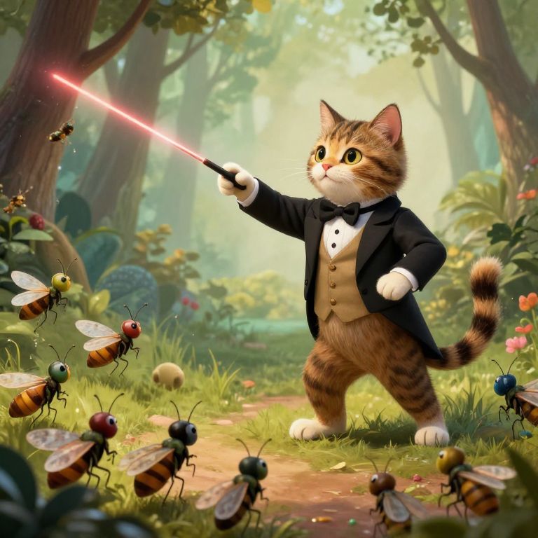 In a whimsical realm where imagination reigns supreme, a feline maestro adorned in formal attire wields a laser pointer as a baton, conducting an enchanting symphony that ignites wonder and captivates an audience of enchanted insects, their synchronized movements mirroring the harmony of creation itself.
