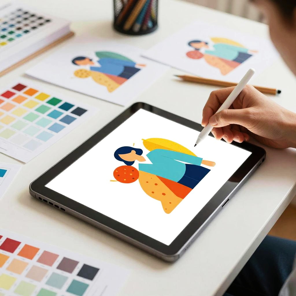 Vector art maker inspired scene featuring an artist’s desk filled with digital tablets, color swatches, and stylus pens, illuminated by soft natural light, with partially completed bold and colorful vector illustrations scattered around, inviting creativity and innovation.