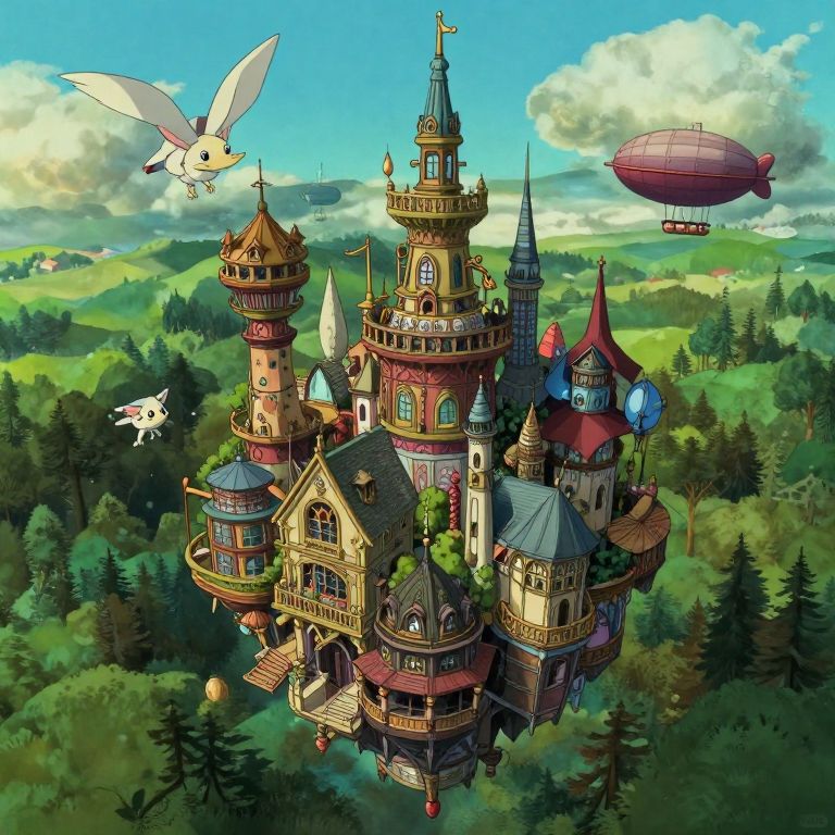 A surreal landscape imbued with whimsical charm, reminiscent of dreamy watercolor paintings that blur the lines between reality and fantasy. In this captivating world, gravity-defying elements such as floating islands and levitating buildings create a mesmerizing scene from an ant-sized creature's 'bug's-eye view'. The luminous sky above is filled with mythical creatures and fantastical flora, evoking feelings of wonderment and enchantment while inviting viewers to explore the delicate balance between these two realms.