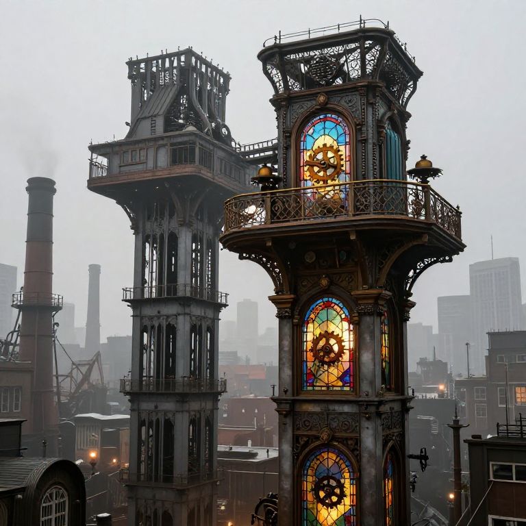 Photograph of steampunk-style clock towers with vibrant stained glass windows, set against a foggy industrial cityscape with chimneys and factories.