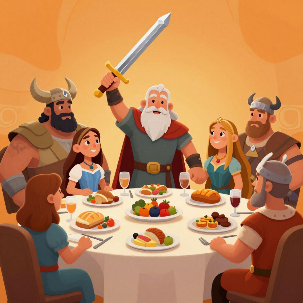 The image is a vibrant, cartoon-style illustration depicting a banquet in Valhalla, featuring a group of Viking gods and goddesses. The central figure is an elderly man with a long beard, holding a large, ornate sword upright in the air. Surrounding him are various other characters, including a muscular man with a beard and horns, a woman with long hair, and a young girl with a blue dress. The table is adorned with an array of food and drinks, including bread, fruits, and glasses, suggesting a feast. The background is a warm, orange hue, creating a cozy and inviting atmosphere. The overall composition is balanced, with the characters and objects arranged in a way that draws the viewer's eye towards the central figure and the sword. The use of bold colors and exaggerated features gives the scene a lively and dynamic feel, capturing the essence of a lively Viking banquet.